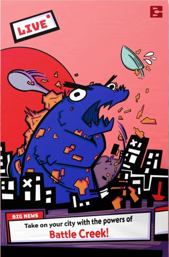 Battle Creek is a cereal company that brings in-your-face monster combat and a world of cereal to the breakfast table. Using sugary rage to entice the viewer and connect them to the feeling they would get by consuming this cereal. The power to go toe-to-toe with the tough parts of your day! Grainzilla’s super strength, Cinnamoth’s pyrokinesis, and Carbohydra’s chilling bite could all be yours. So grab a bowl, a plate, a fistful, however you want. Take on the city!