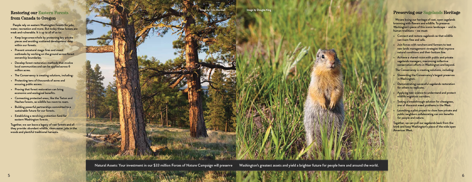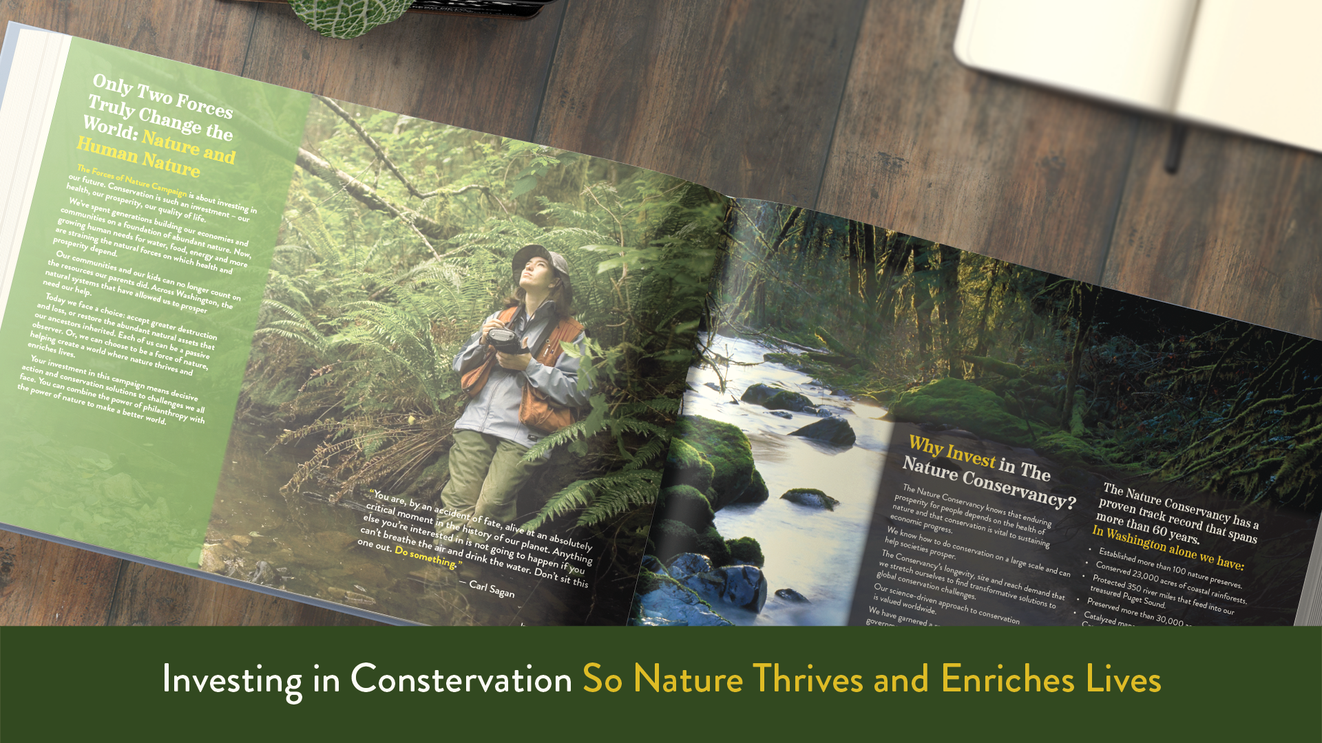 The Forces of Nature is a campaign that was done by The Nature Conservancy to promote readers to donate. Allowing them to continue their conservation efforts in protecting millions of acres, worldwide, for future generations to enjoy. This was a student project done while attending Florida Southern College and this specific campaign was actually executed a decade prior to us receiving the job prompt by our professor. However, we were granted an opportunity to play the role of our professor and create the book, using those same assets, in our own vision.